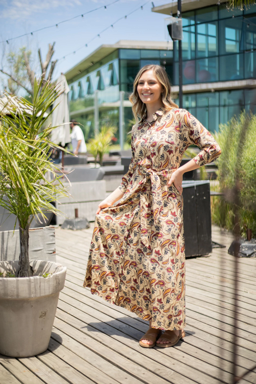 Es un vestido camisero, abotonado en todo el frente y con tirilla en el codo para acortar la manga, ideal para cualquier ocasión donde quieras estar esplendida, comoda y fresca.