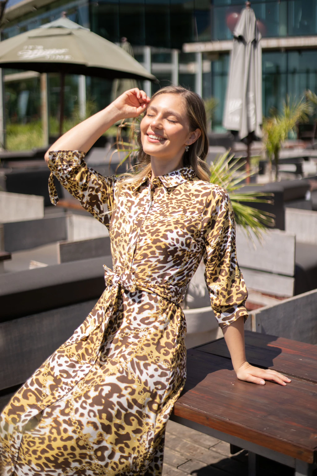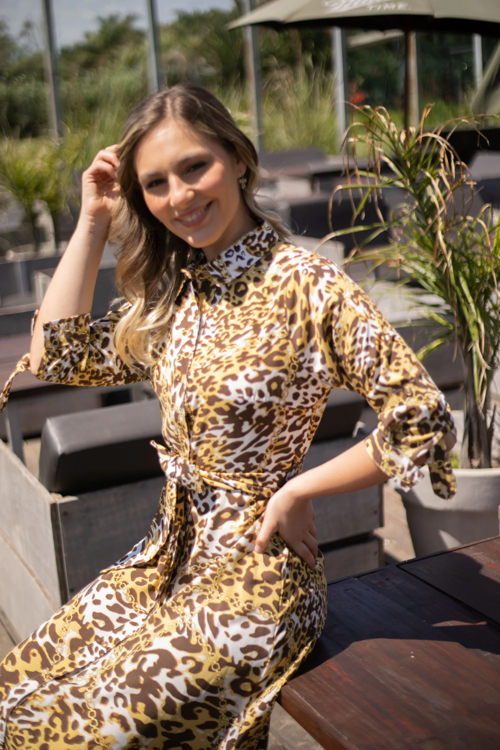 Es un vestido camisero, abotonado en todo el frente y con tirilla en el codo para acortar la manga, ideal para cualquier ocasión donde quieras estar esplendida, comoda y fresca.